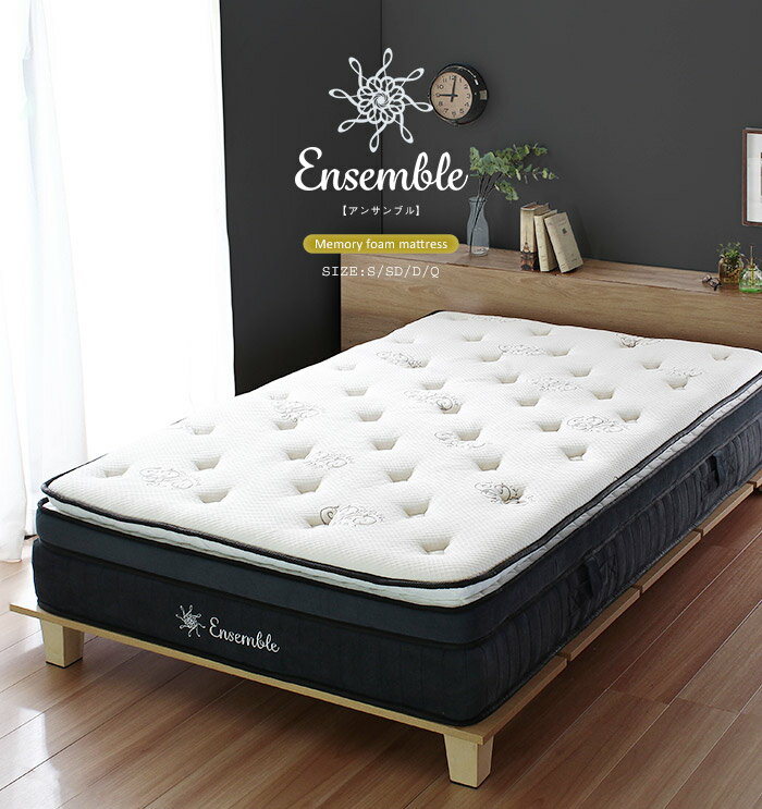 Ensemble メモリーフォームマットレス (シングル) 【サイズ】(cm) S : 97×195×27 【梱包サイズ】(cm):圧縮ロール S : 35×35×55 / 27×27×104 【コイル】 (ボトム)線形2.0mm / 4.5巻 (ボトム)コイル数 S:465 【中材】 (トッパー)低反発ウレタンD50/スーパーソフトウレタンD25/ソフトウレタンD25/ポリエステル綿 (ボトム)コイルスプリング(SWRH67B C種)/ウレタンフォーム/フェルト 【生地の組成】 ◆トッパークッション (表面)オーガニックコットン35% + ポリエステル65% (側面)ポリエステル100% (裏面)ポリエステル100%(滑り止め生地) ◆ボトムクッション (表面)ポリエステル100%(滑り止め生地) (側面)ポリエステル100% (裏面)不織布 ※片面仕様のマットレスとなります。
